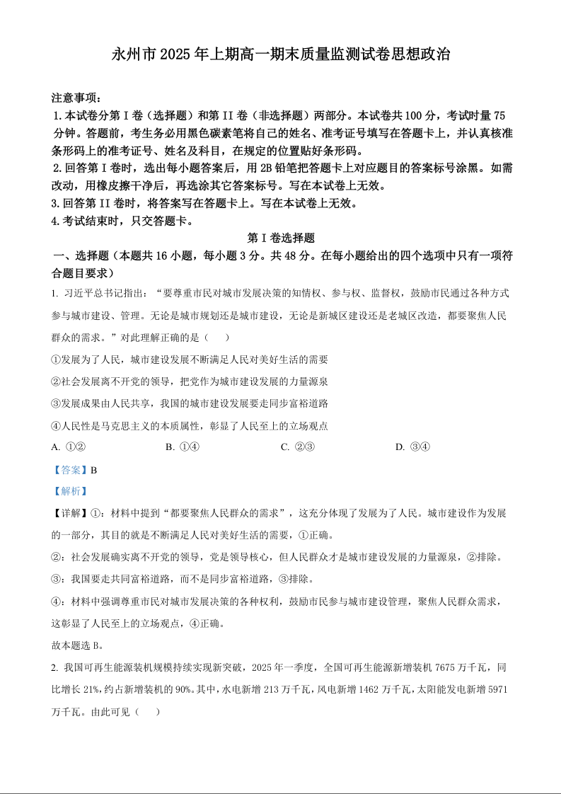 湖南省永州市2024-2025学年高一下学期期末质量监测 政治答案.docx