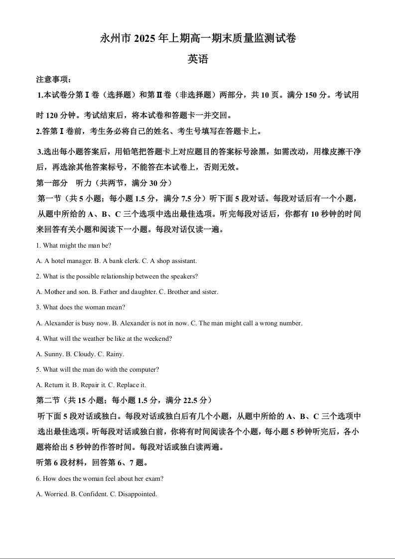 湖南省永州市2024-2025学年高一下学期期末质量监测 英语答案.docx