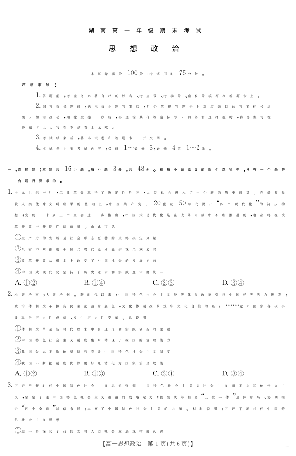 湖南省2024-2025学年高一年级下学期7月期末考试 政治.pdf