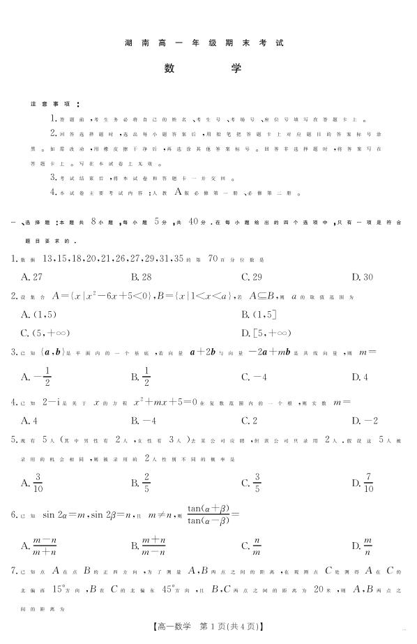 湖南省2024-2025学年高一年级下学期7月期末考试 数学.pdf