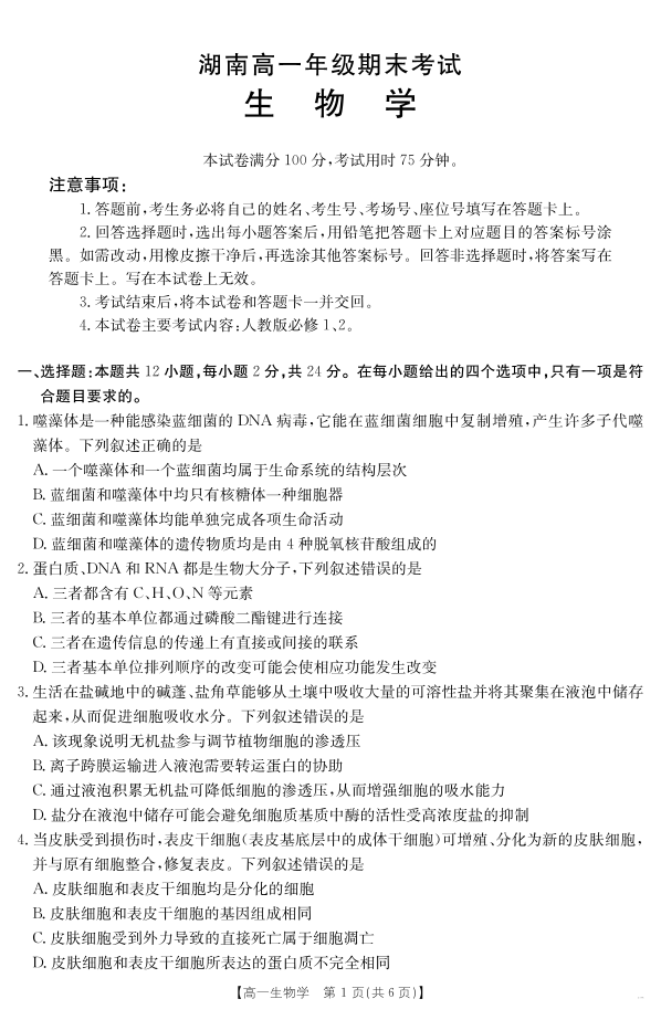 湖南省2024-2025学年高一年级下学期7月期末考试 生物学.pdf