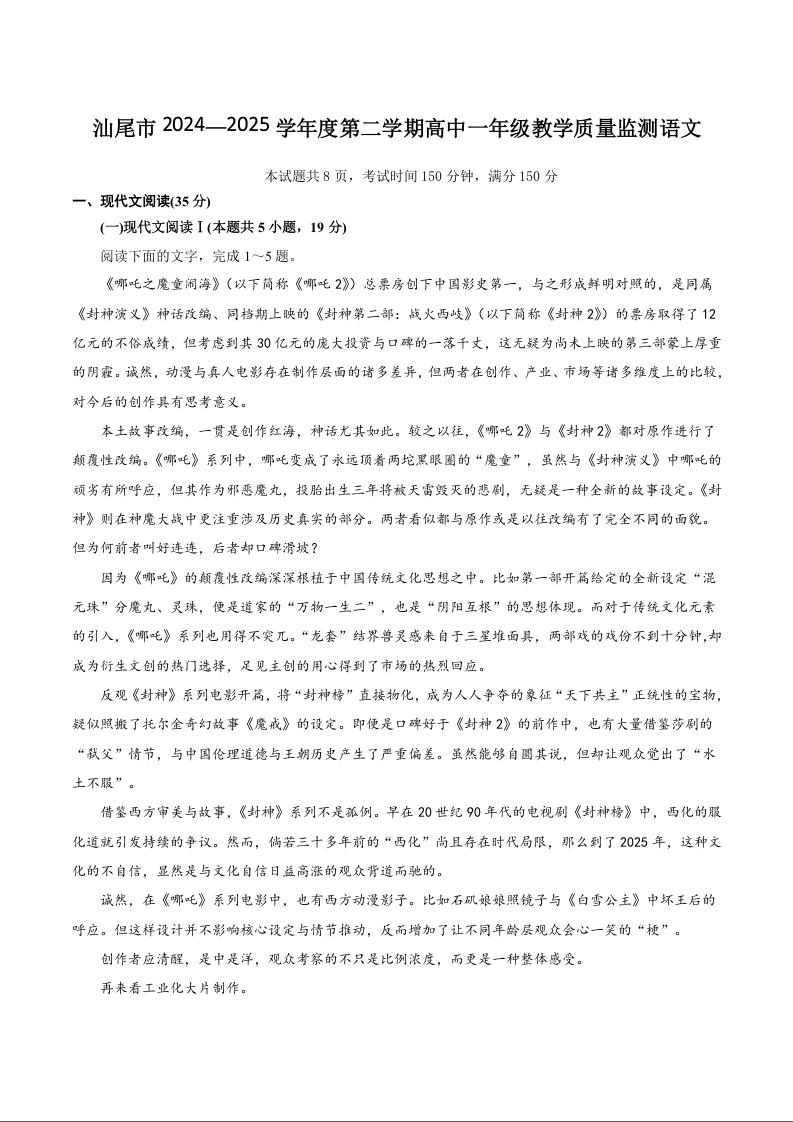 汕尾市2024—2025学年度第二学期高中一年级教学质量监测 语文试卷(含答案).docx