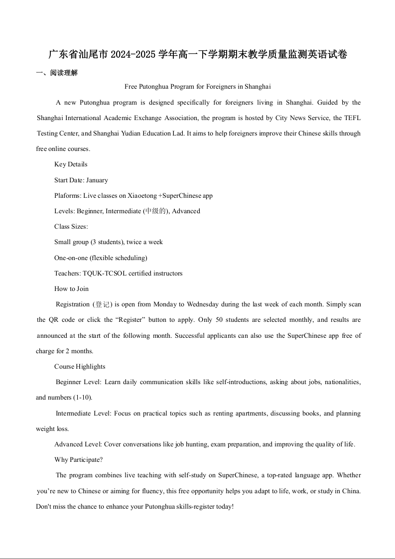 汕尾市2024—2025学年度第二学期高中一年级教学质量监测 英语试卷(含答案).docx
