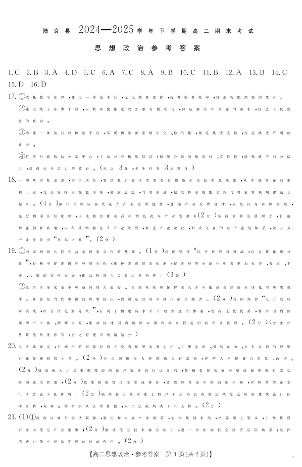 云南省曲靖市陆良县2024-2025学年高二下学期期末考试 政治答案.pdf