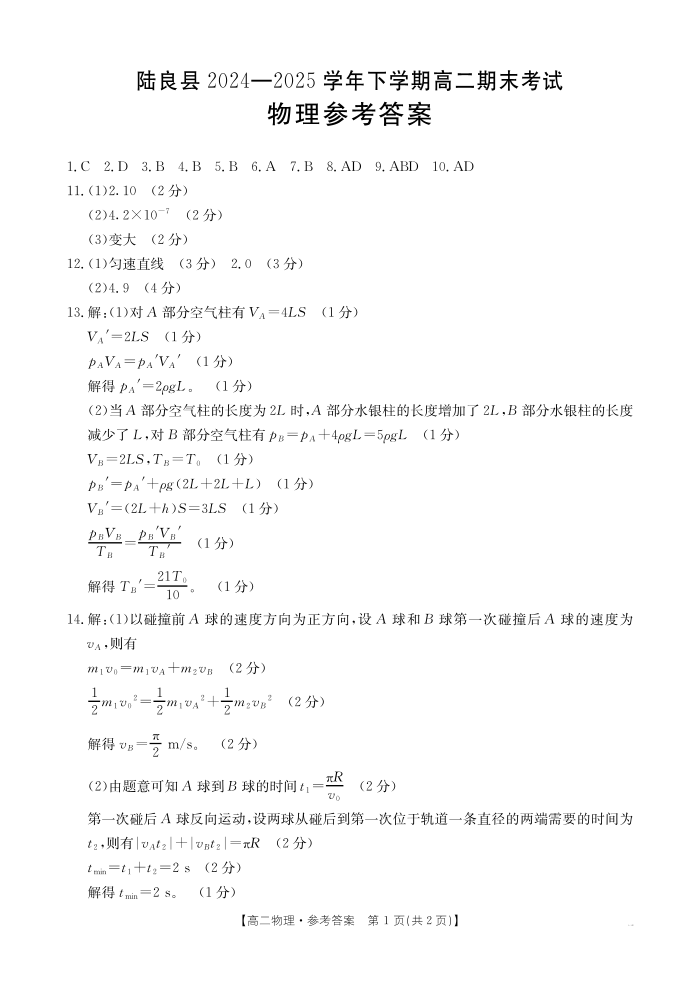 云南省曲靖市陆良县2024-2025学年高二下学期期末考试 物理答案.pdf