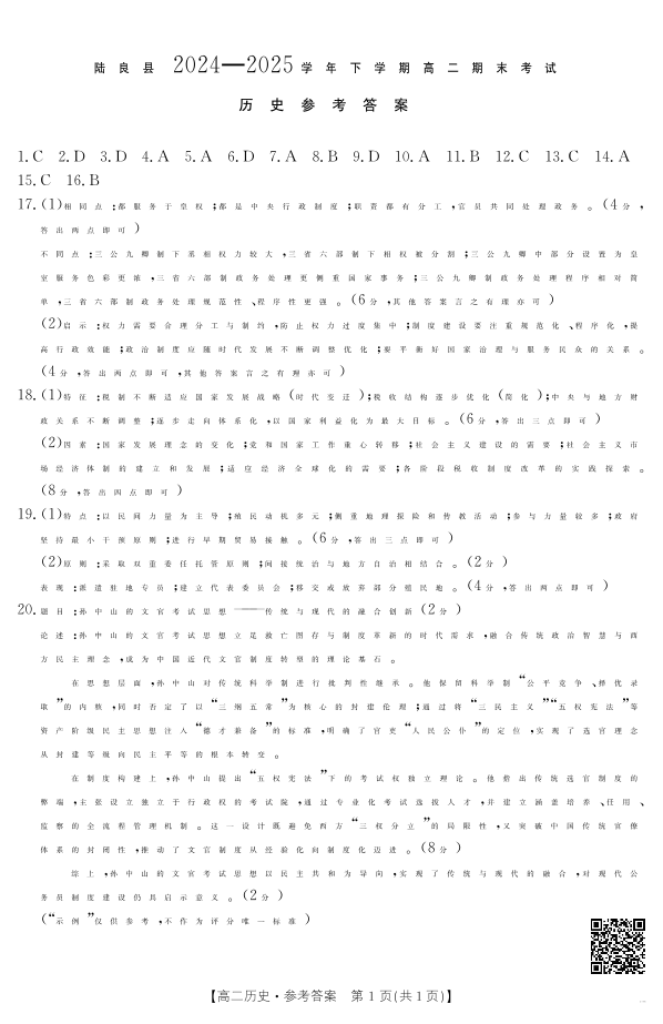 云南省曲靖市陆良县2024-2025学年高二下学期期末考试 历史答案.pdf
