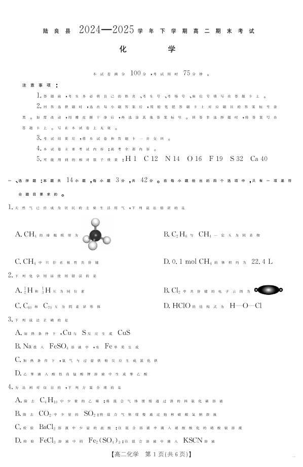云南省曲靖市陆良县2024-2025学年高二下学期期末考试 化学.pdf