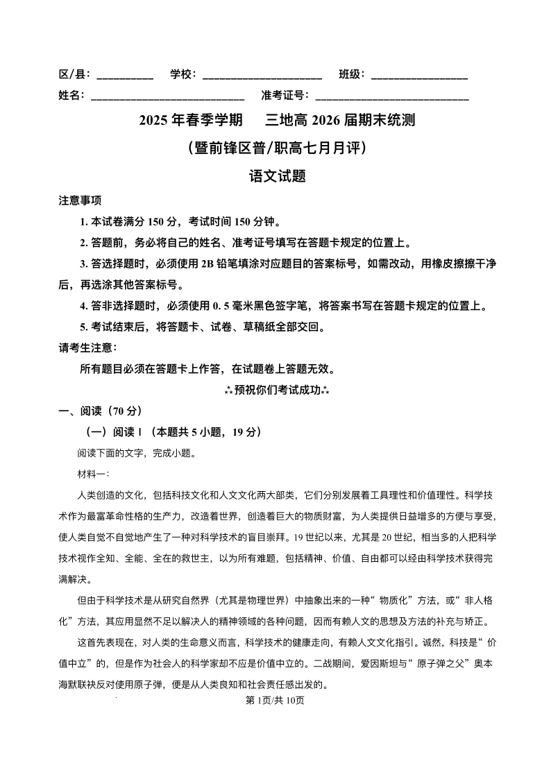 2025年春季学期三地高2026届期末统测 语文试卷(含答案).pdf