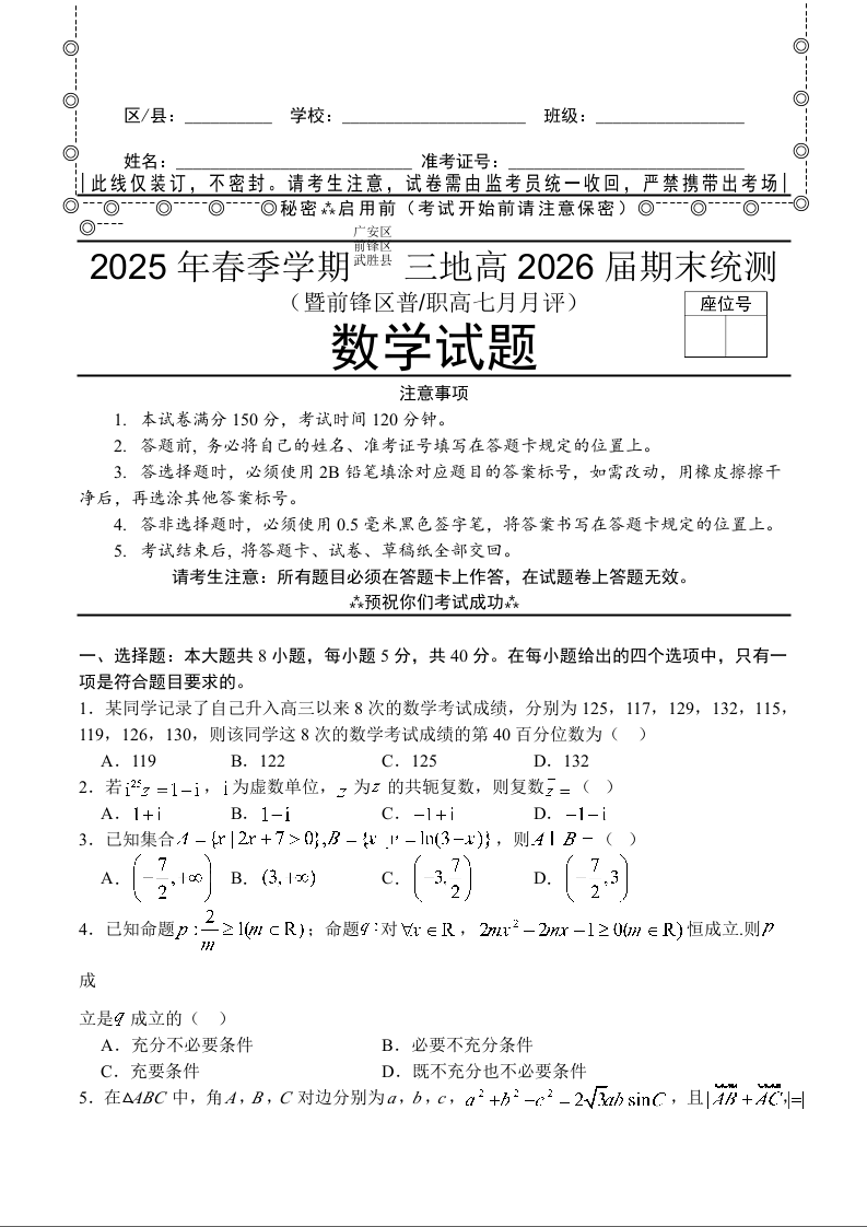 2025年春季学期三地高2026届期末统测 数学试卷(含答案).docx