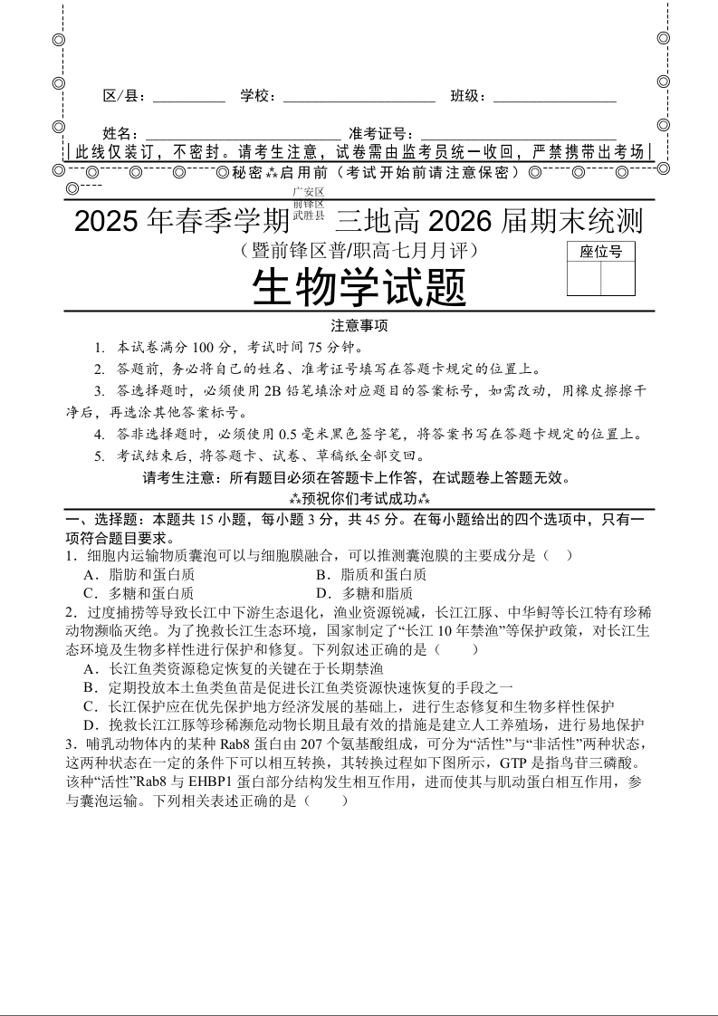 2025年春季学期三地高2026届期末统测 生物试卷(含答案).docx