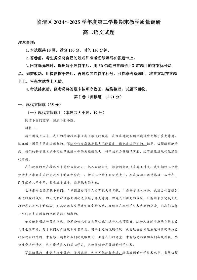 临渭区2024~2025学年度第二学期期末教学质量调研 语文试卷(含答案).docx