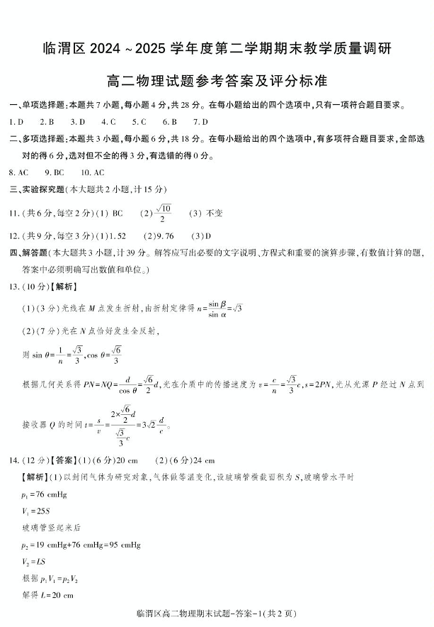 临渭区2024~2025学年度第二学期期末教学质量调研 物理答案.pdf