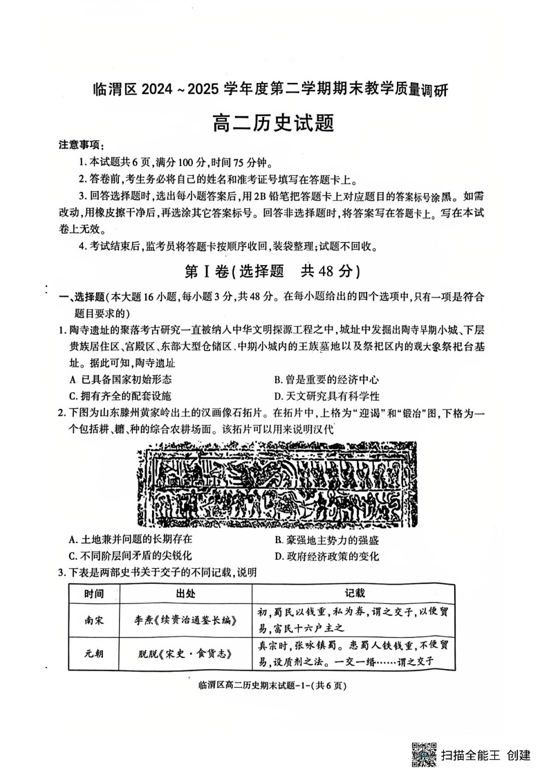 临渭区2024~2025学年度第二学期期末教学质量调研 历史.pdf