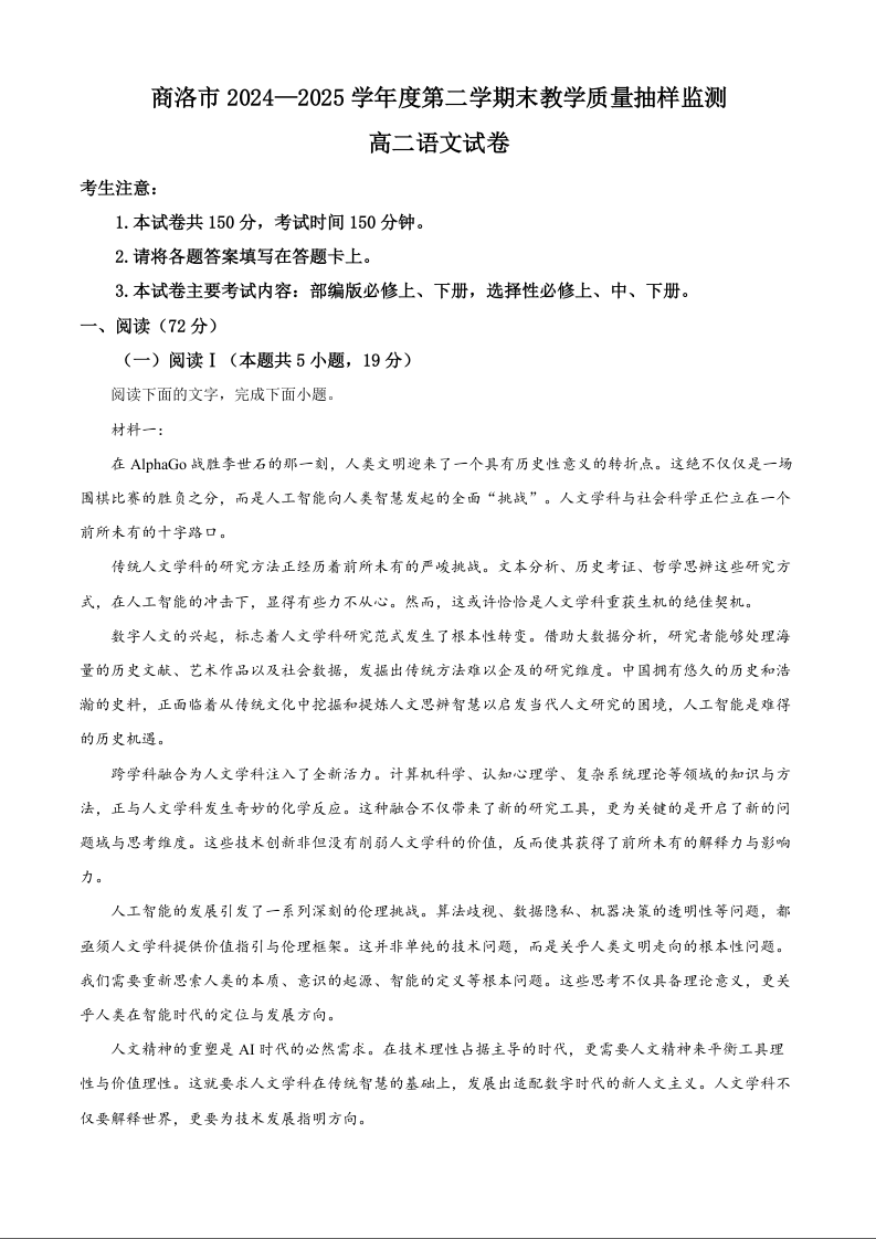 商洛市2024—2025学年度第二学期末教学质量抽样监测 语文试卷(含答案).docx
