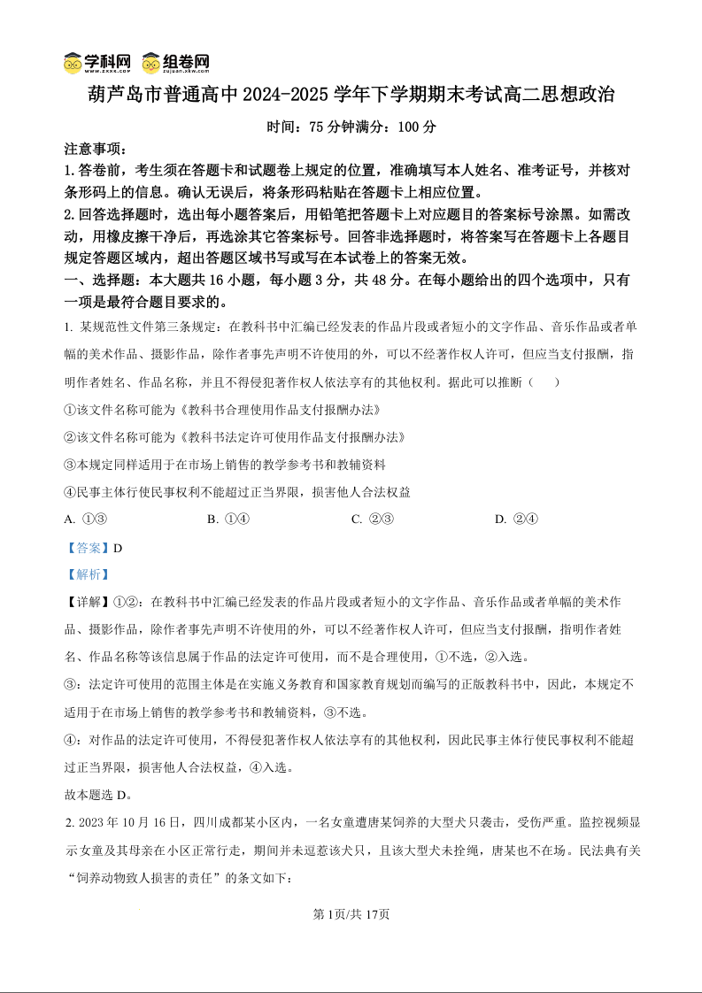 葫芦岛市普通高中2024-2025学年下学期期末考试 政治答案.docx