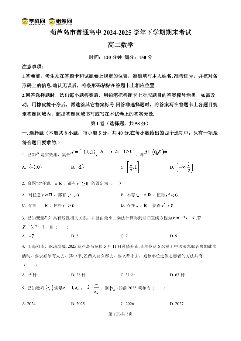 葫芦岛市普通高中2024-2025学年下学期期末考试 数学.docx