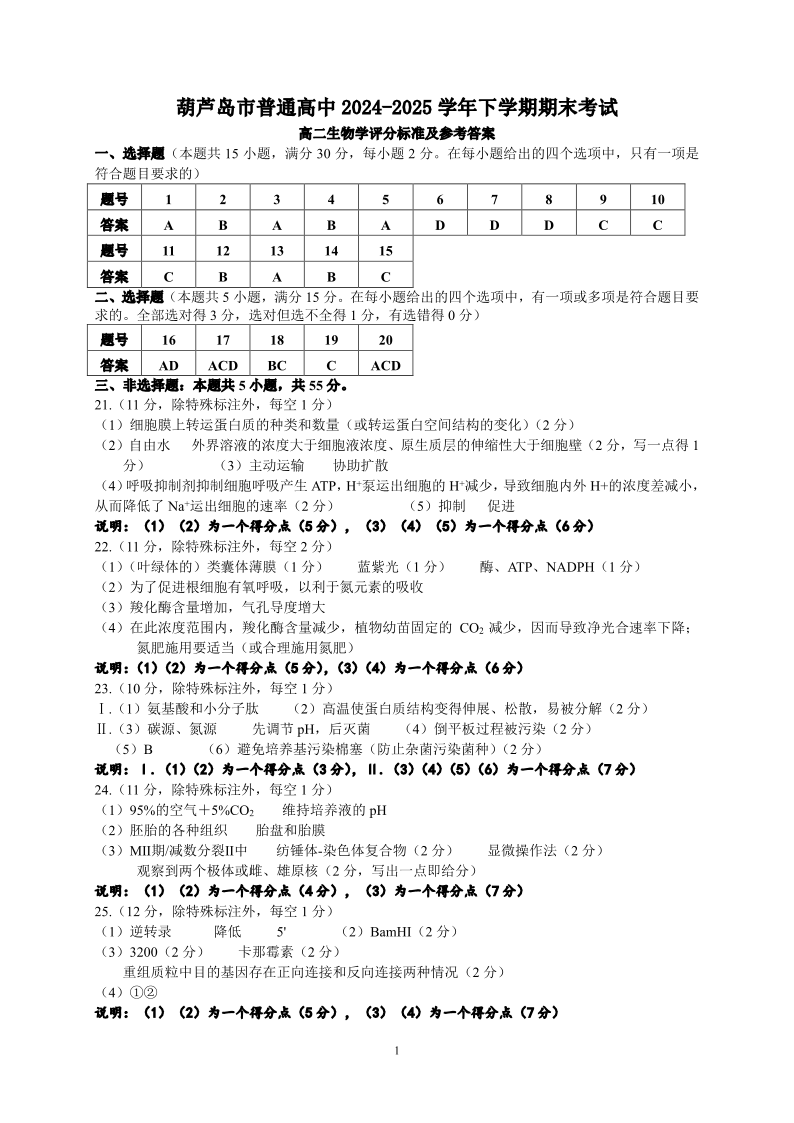 葫芦岛市普通高中2024-2025学年下学期期末考试 生物答案.pdf