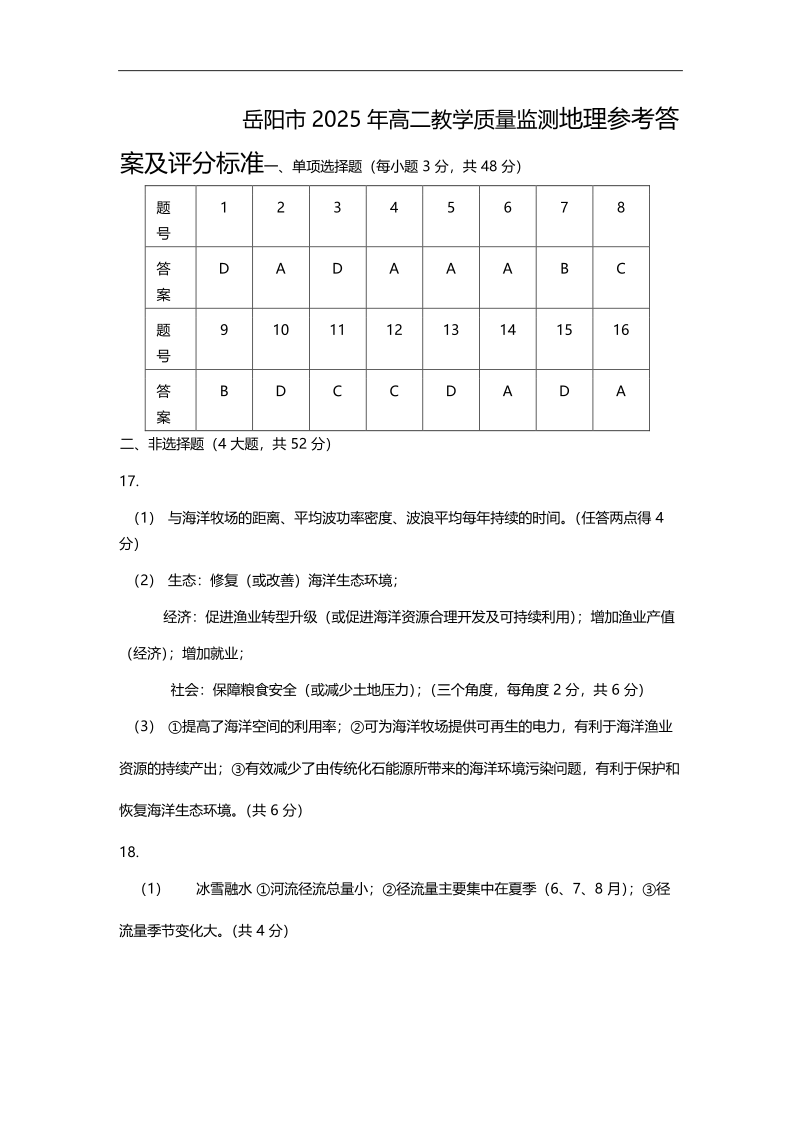 湖南省岳阳市2024-2025学年高二下学期期末教学质量监测 地理答案.pdf