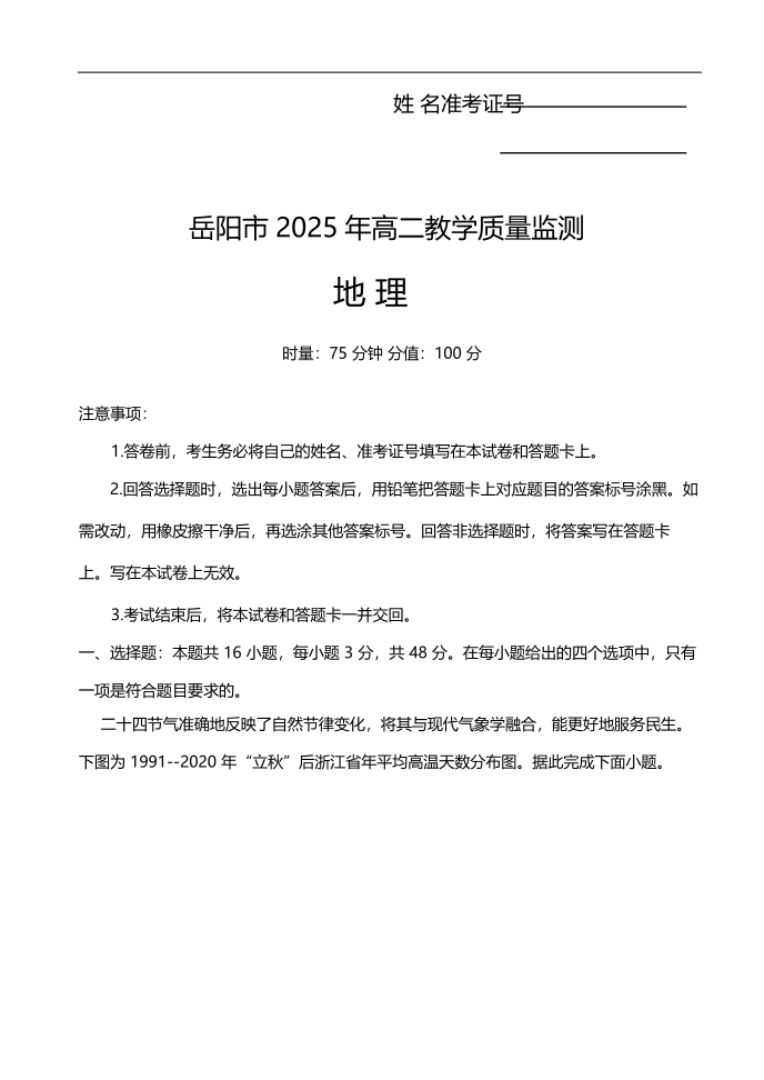湖南省岳阳市2024-2025学年高二下学期期末教学质量监测 地理.pdf