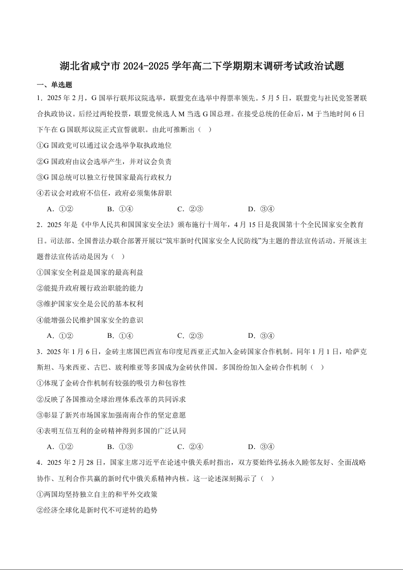 湖北省咸宁市2024-2025学年高二下学期期末考试 政治试卷(含答案).docx