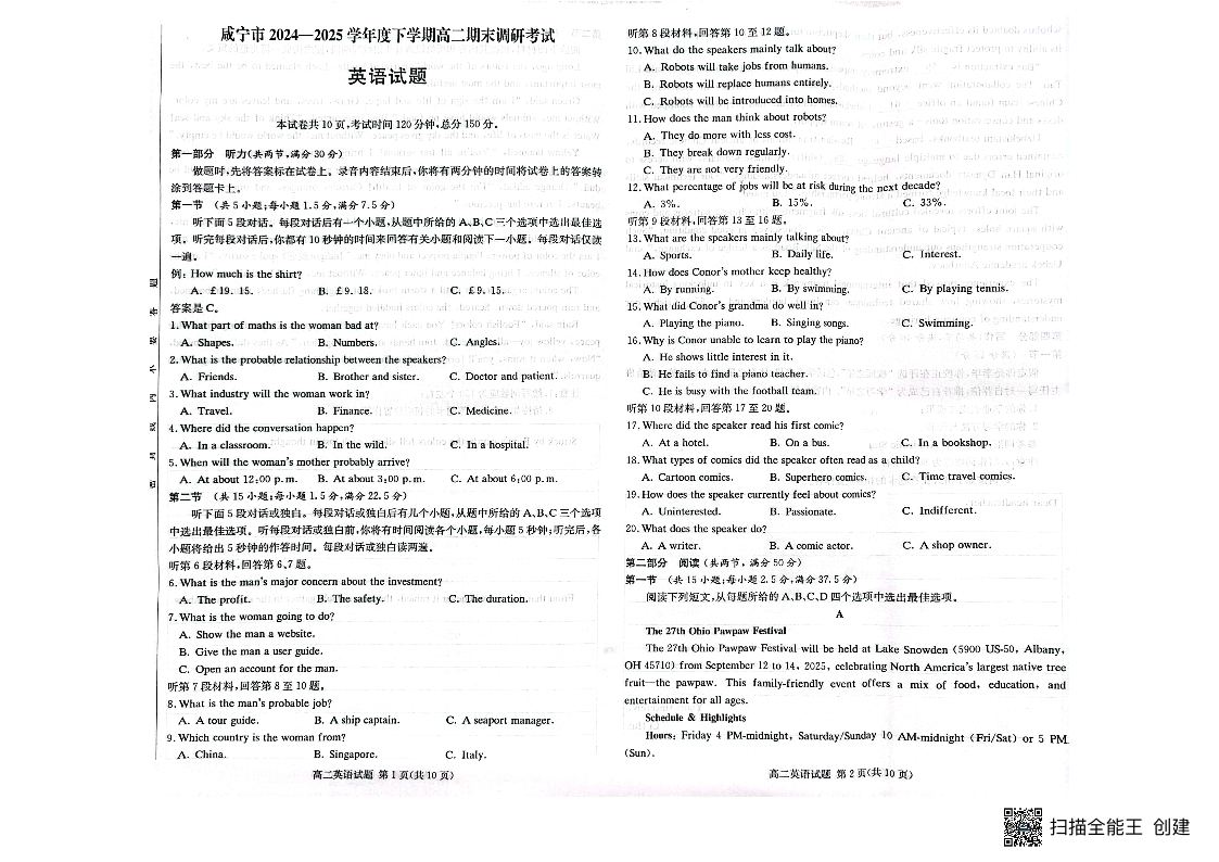 湖北省咸宁市2024-2025学年高二下学期期末考试 英语试卷(含答案).pdf