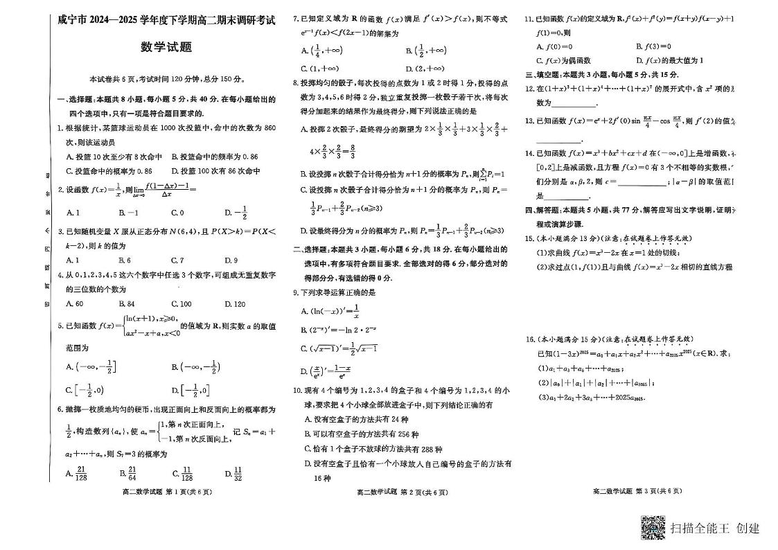 湖北省咸宁市2024-2025学年高二下学期期末考试 数学.pdf
