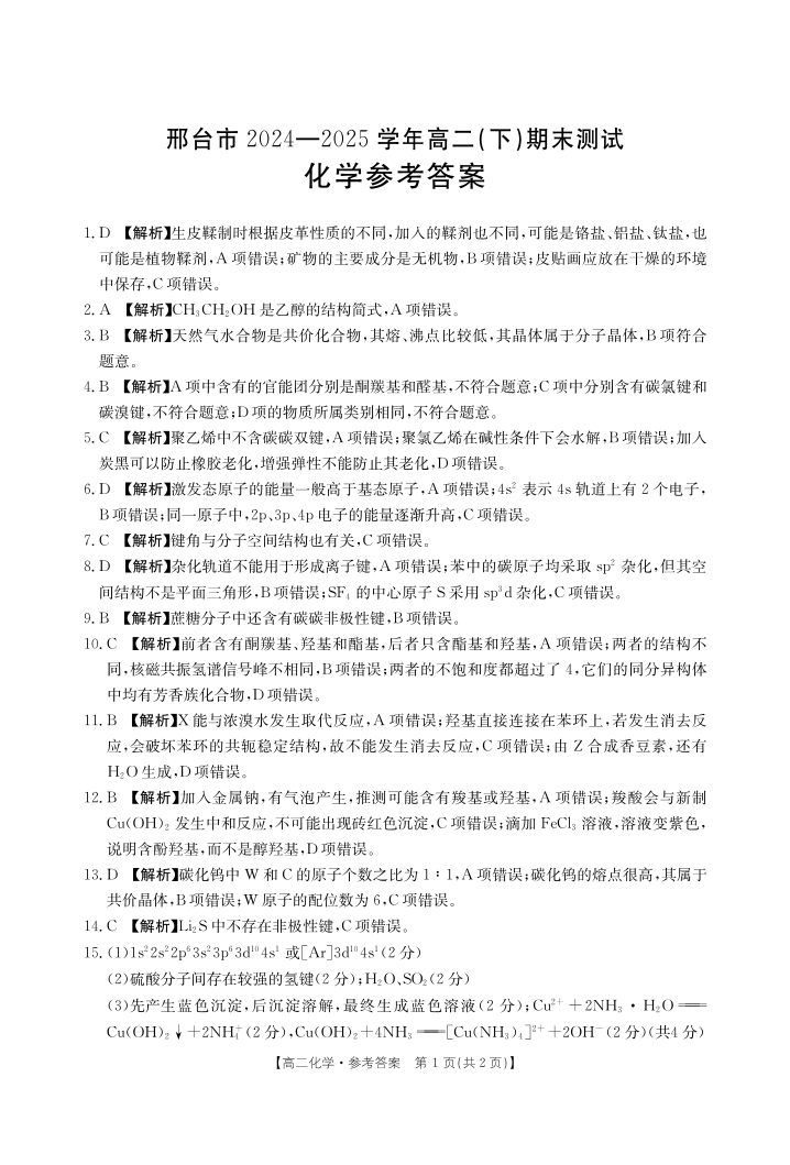 河北省邢台市2024-2025学年高二下学期7月期末测试 化学答案.pdf