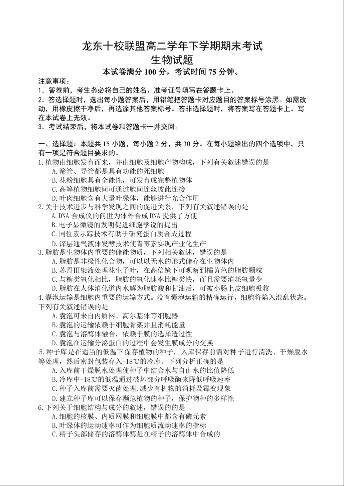 龙东十校联盟2024-2025学年高二下学期期末考试 生物.docx