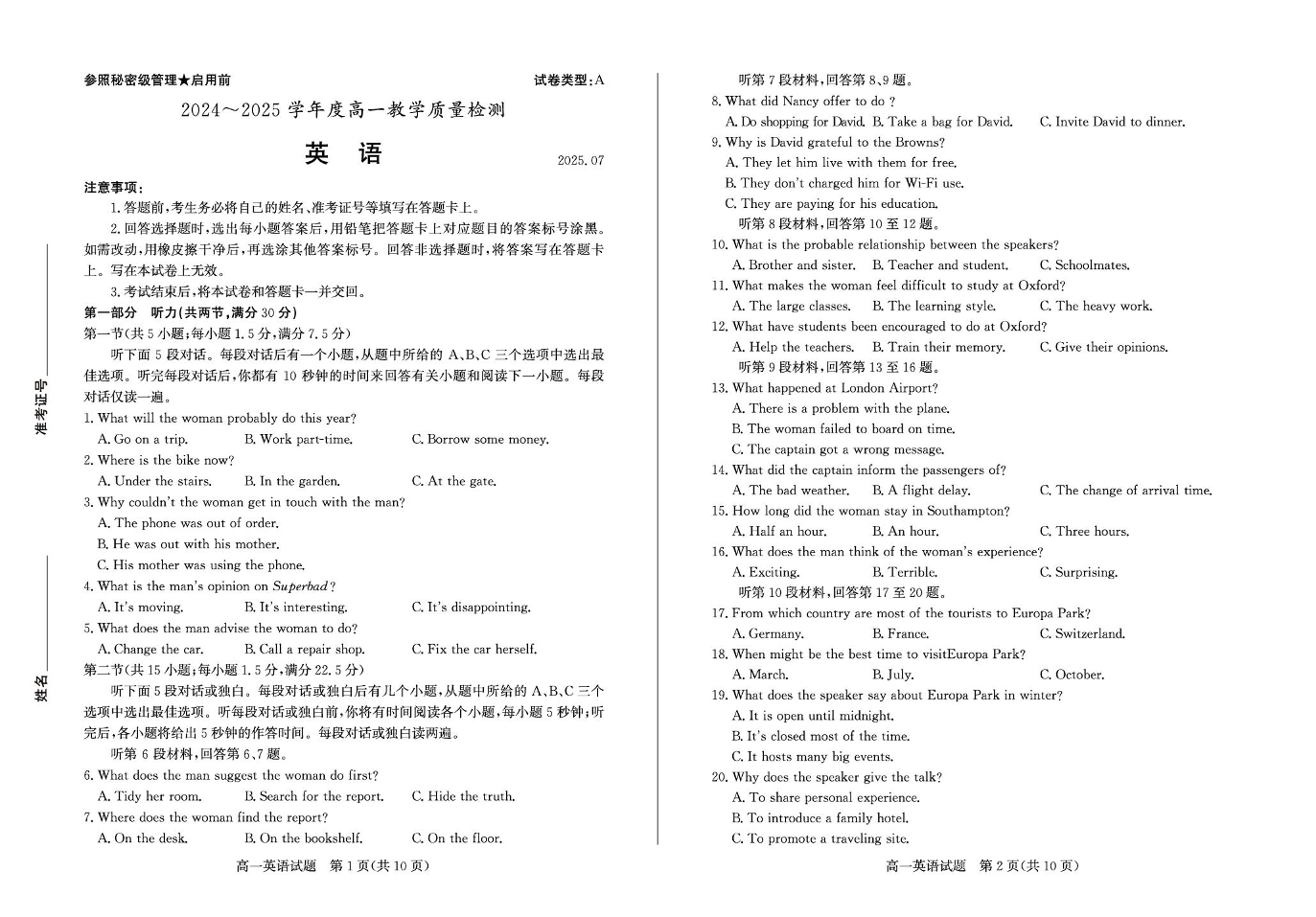 山东省枣庄市2024-2025学年高一下学期期末考试 英语(含答案).pdf