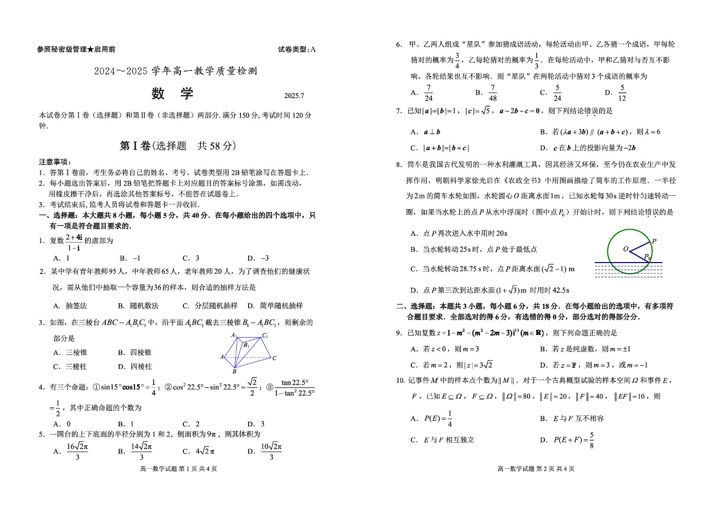 山东省枣庄市2024-2025学年高一下学期期末考试 数学(含答案).pdf