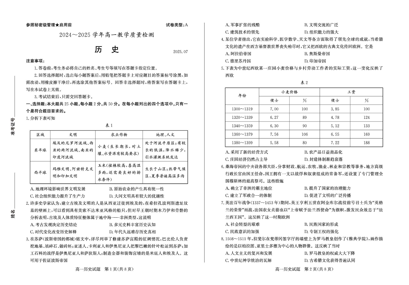 山东省枣庄市2024-2025学年高一下学期期末考试 历史(含答案).pdf