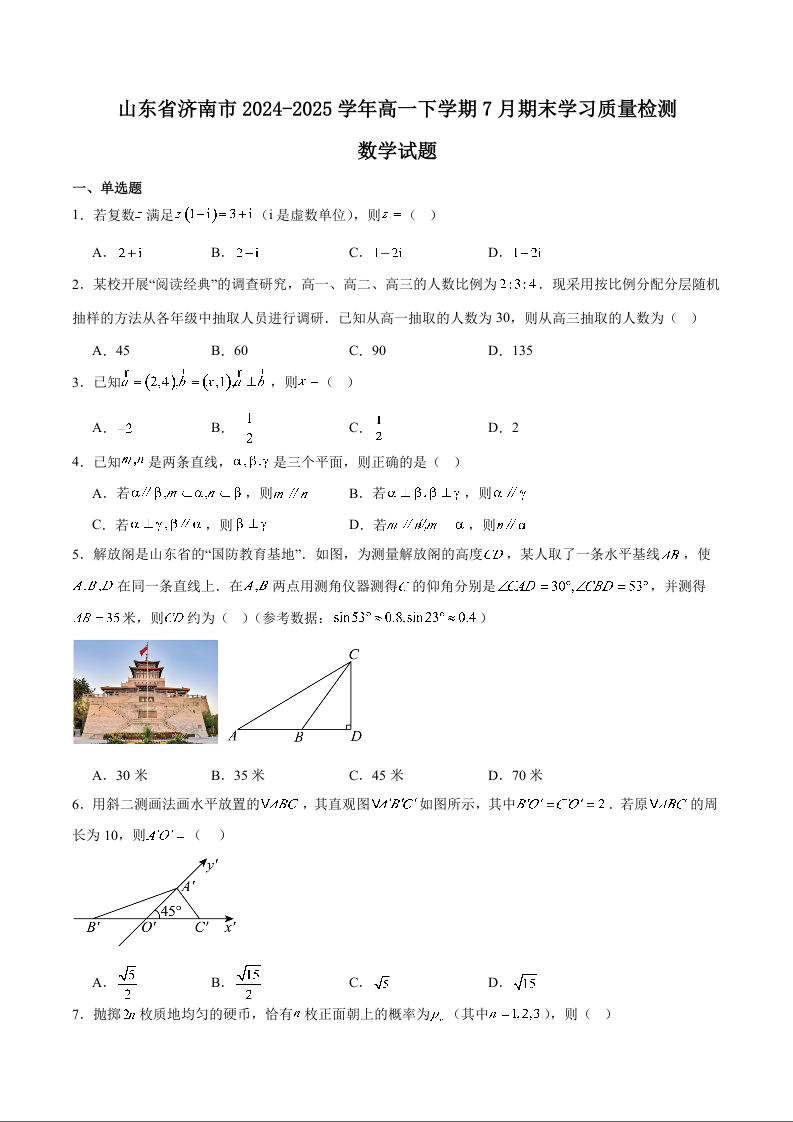 2025年7月济南市高一期末学习质量检测 数学(含答案).docx