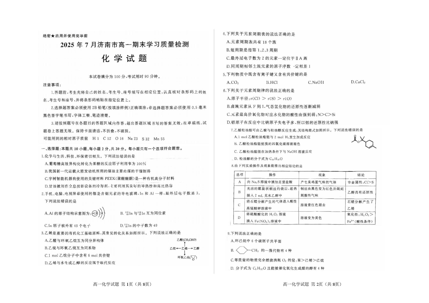 2025年7月济南市高一期末学习质量检测 化学(含答案).pdf