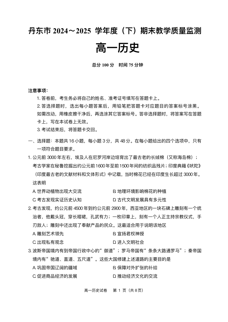辽宁省丹东市2024-2025学年高一下学期期末教学质量监测 历史(含答案).pdf