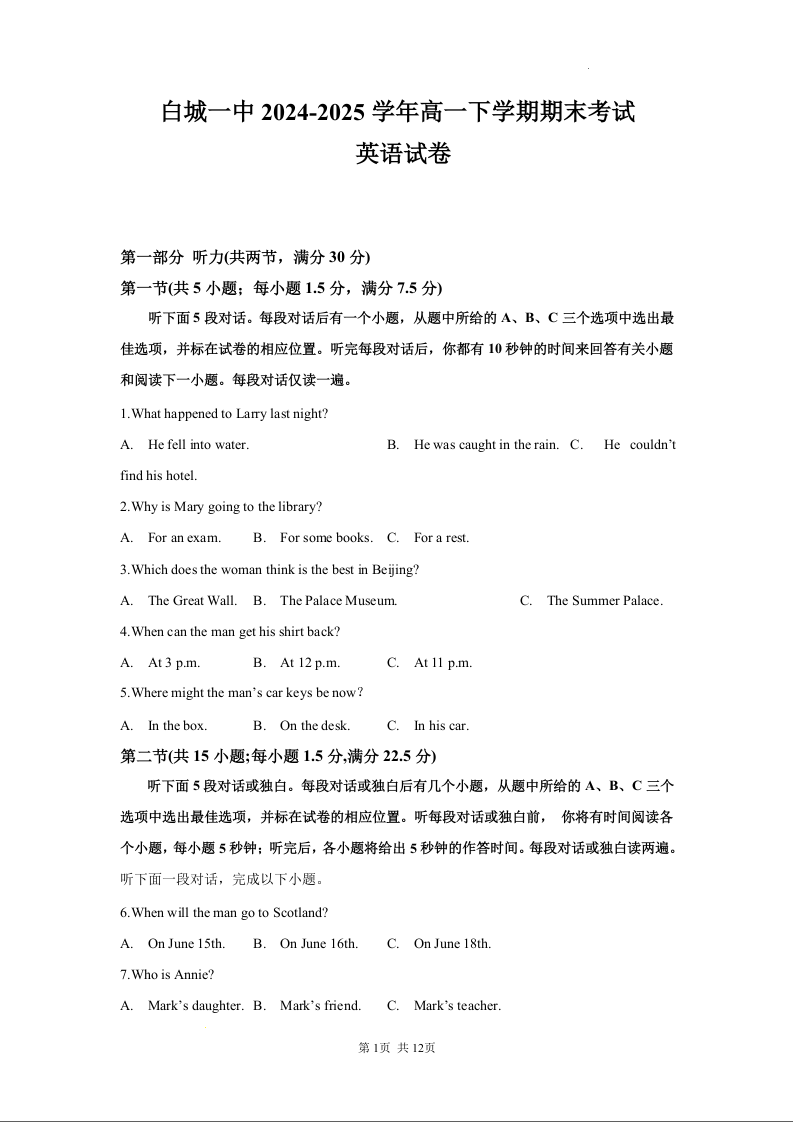 白城一中2024-2025学年度高一下学期期末考试 英语.docx