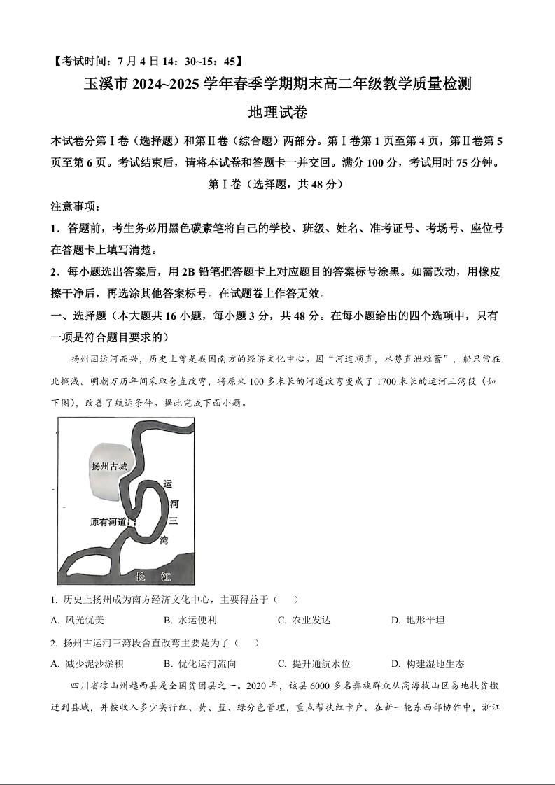 玉溪市2024~2025学年春季学期期末高二年级教学质量检测 地理(含答案).docx