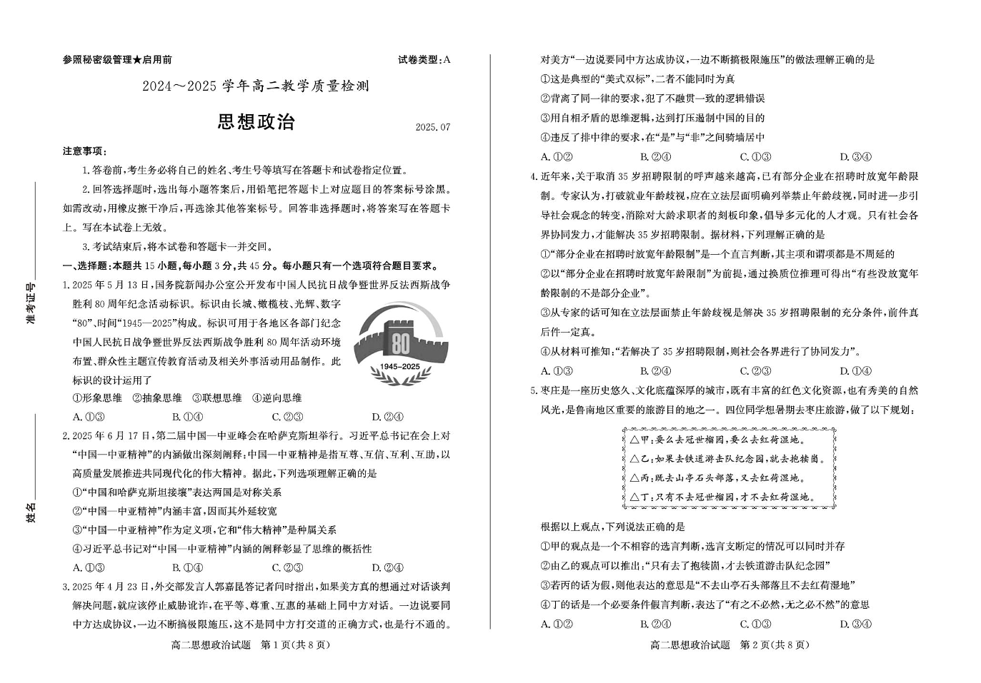 山东省枣庄市2024-2025学年高二下学期期末考试 政治(含答案).pdf