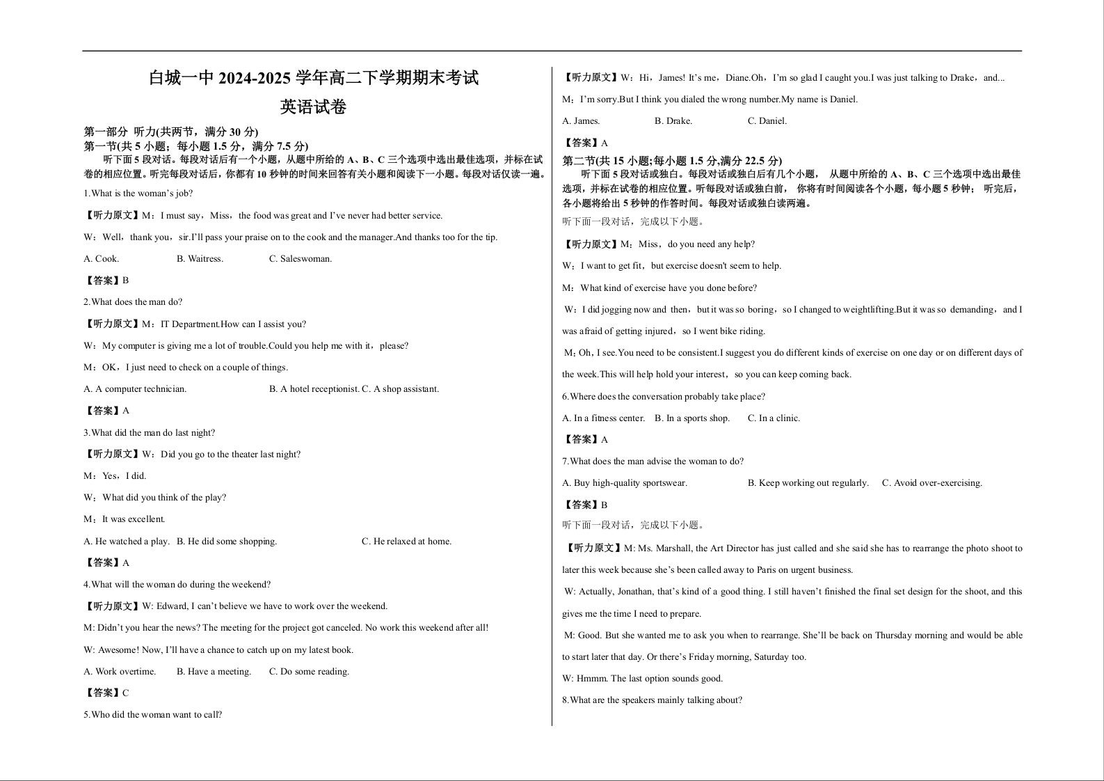 吉林省白城市第一中学2024-2025学年高二下学期期末考试 英语答案.docx