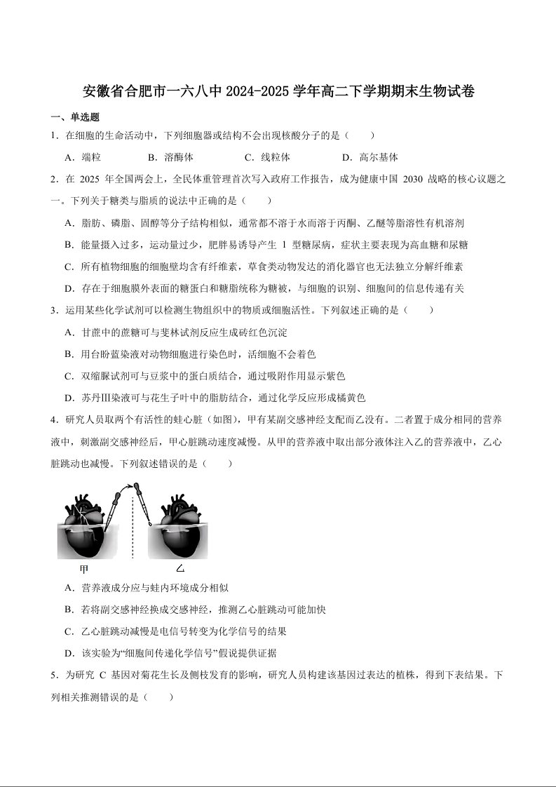 安徽省合肥市一六八中学2024-2025学年高二下学期期末考试 生物(含答案).docx