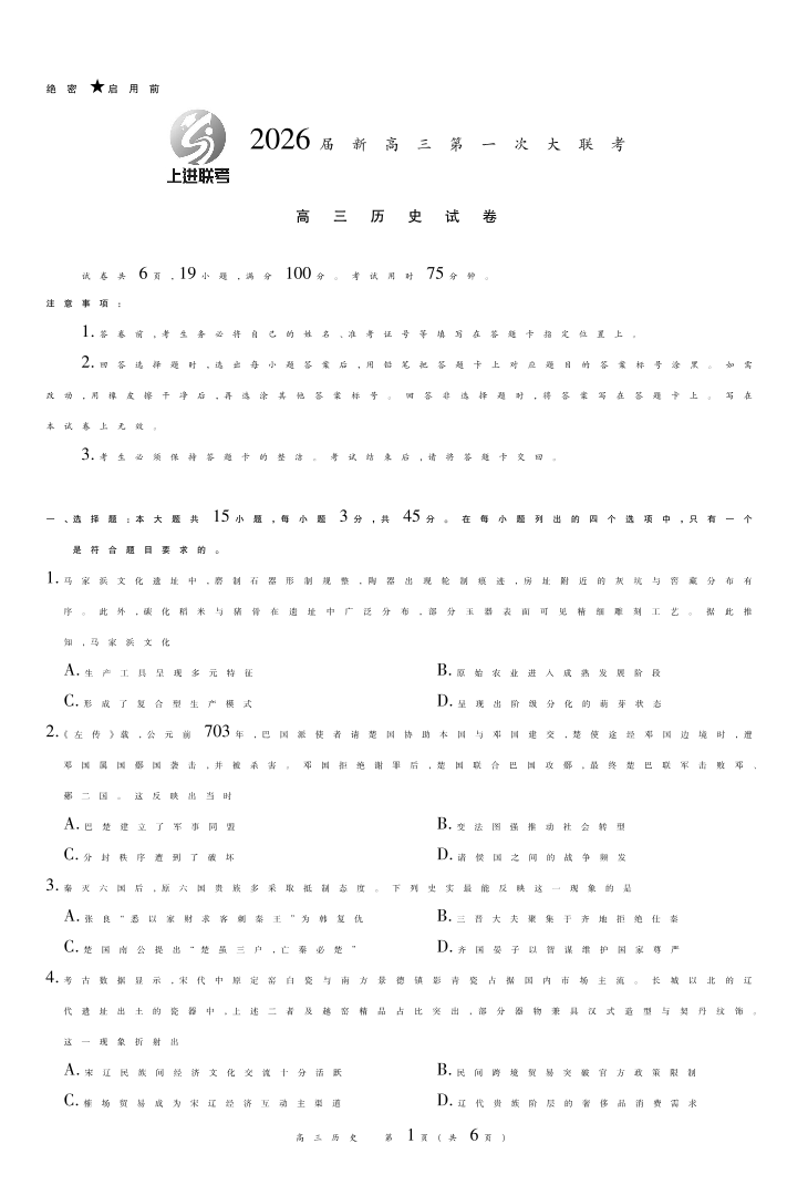 2026届新高三第一次大联考 历史.pdf