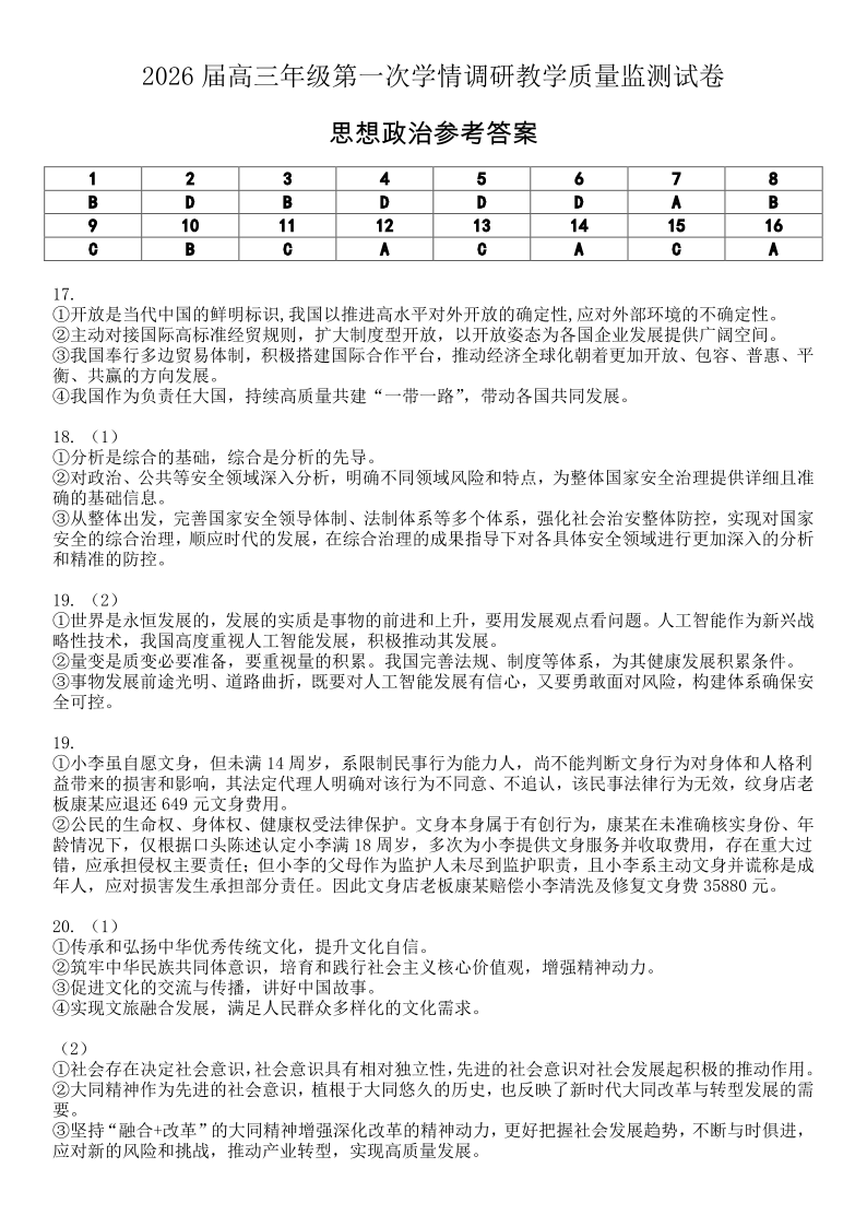大同市2026届高三年级第一次学情调研教学质量监测试题 政治答案.pdf