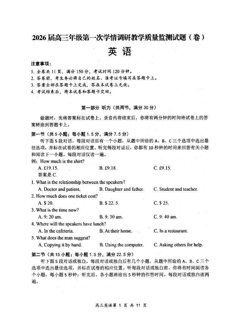 大同市2026届高三年级第一次学情调研教学质量监测试题 英语.pdf