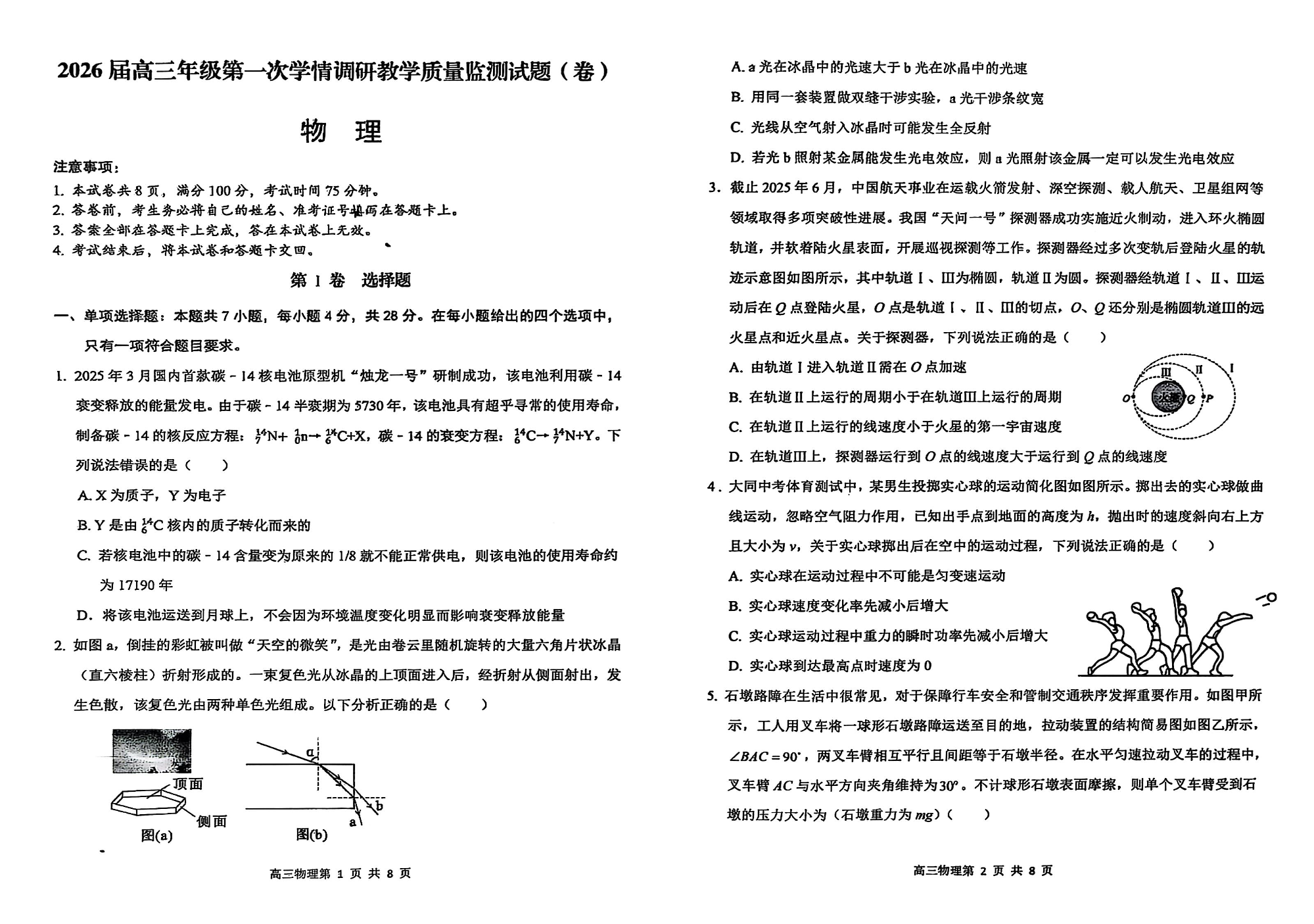 大同市2026届高三年级第一次学情调研教学质量监测试题 物理试卷(含答案).pdf