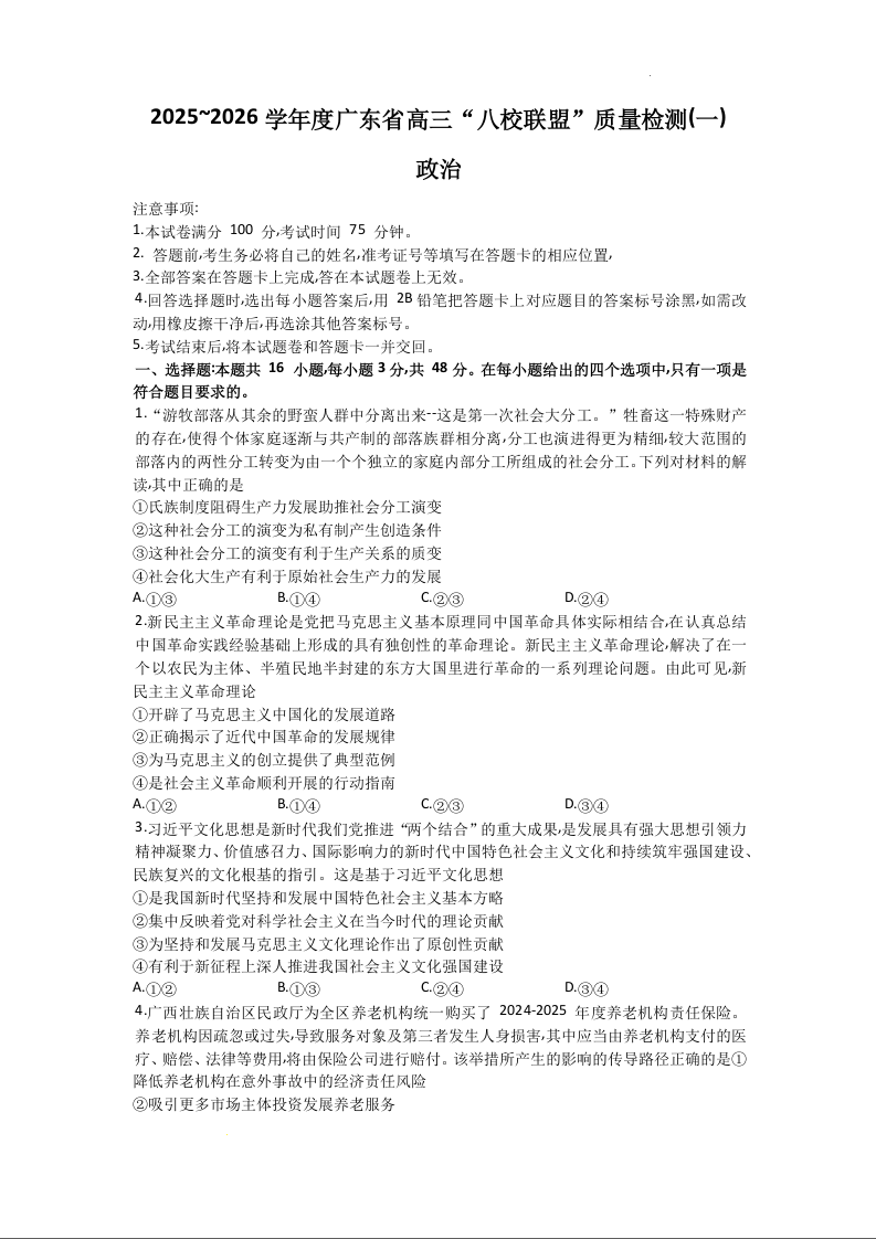 广东省2025~2026学年度高三“八校联盟”质量检测(一)政治.docx