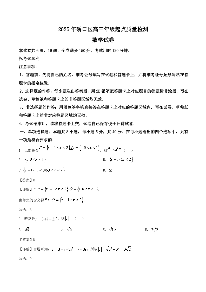 湖北省武汉市硚口区2025年高三年级起点质量检测 数学试卷(含答案).docx