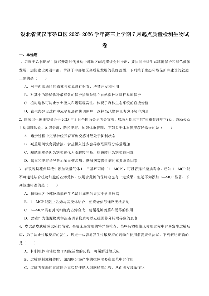 湖北省武汉市硚口区2025年高三年级起点质量检测 生物试卷(含答案).docx