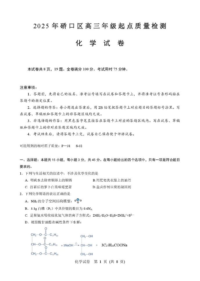 湖北省武汉市硚口区2025年高三年级起点质量检测 化学试卷(含答案).pdf