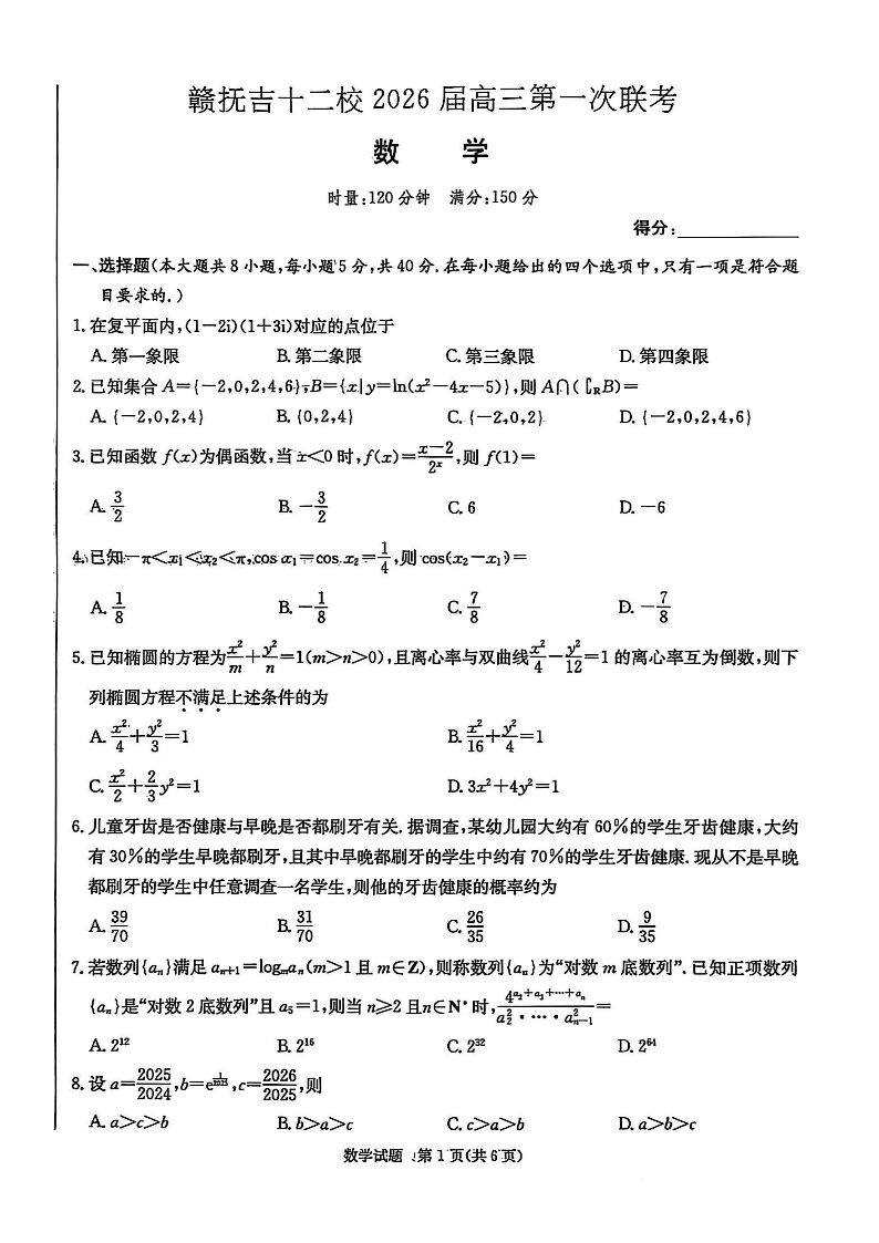 赣抚吉十二校2026届高三第一次联考 数学.pdf