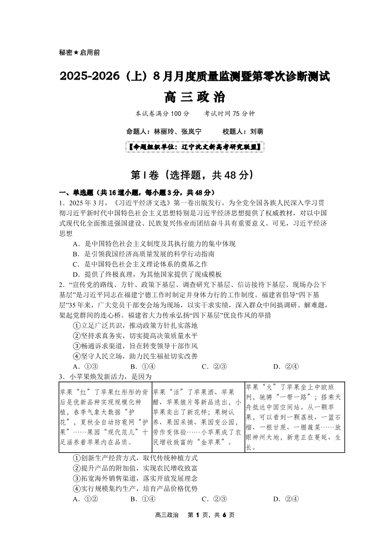 2025-2026(上)8月月度质量监测暨第零次诊断测试 高三政治.pdf
