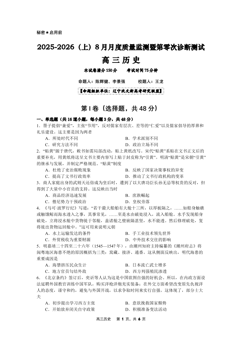 2025-2026(上)8月月度质量监测暨第零次诊断测试 高三历史.pdf